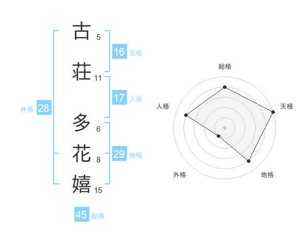 古荘 多花嬉さんを姓名の画数から五運を鑑定