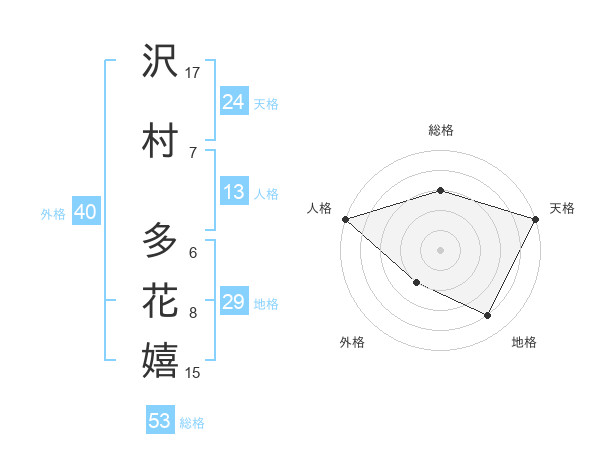 沢村 多花嬉さんを姓名の画数から五運を鑑定