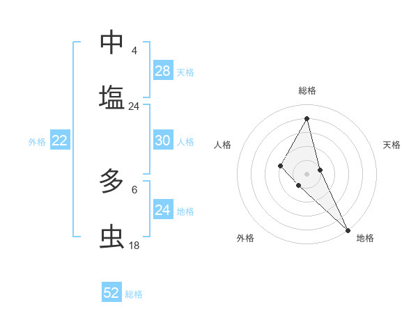 中塩 多虫さんの総格は52画の4点!