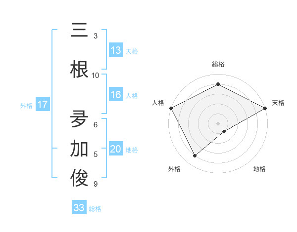 三根 夛加俊さんの総格は33画の4点!