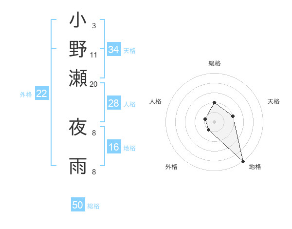 小野瀬 夜雨さんの総格は50画の2点!
