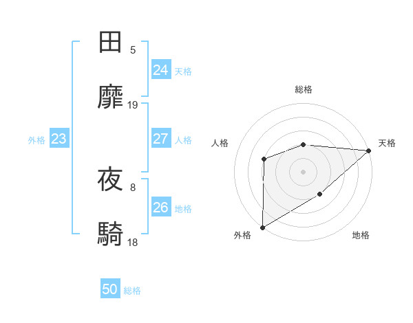 田靡 夜騎さんの総格は50画の2点!