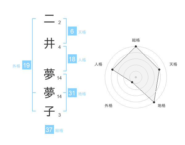 二井 夢夢子さんの総格は37画の5点!
