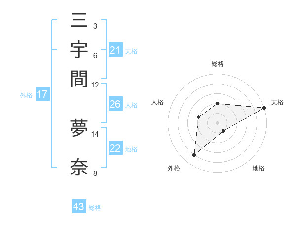 三宇間 夢奈さんを姓名の画数から五運を鑑定