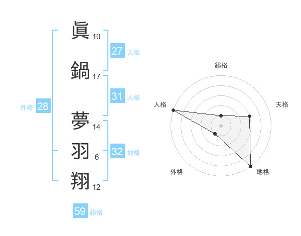 眞鍋 夢羽翔さんの地格は32画の5点!
