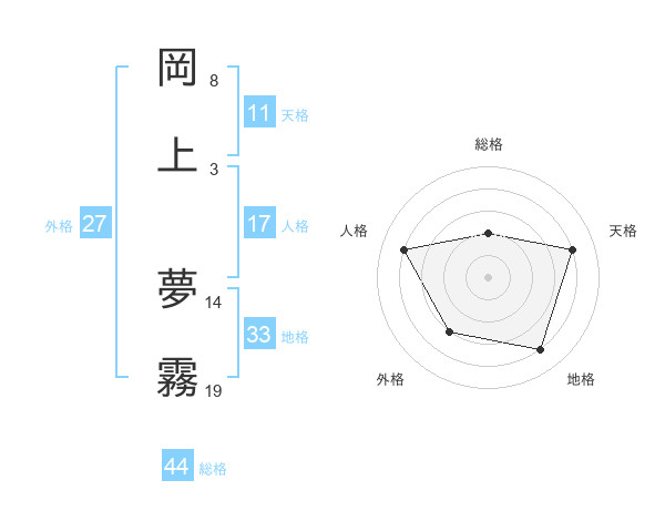 岡上 夢霧さんを姓名の画数から五運を鑑定