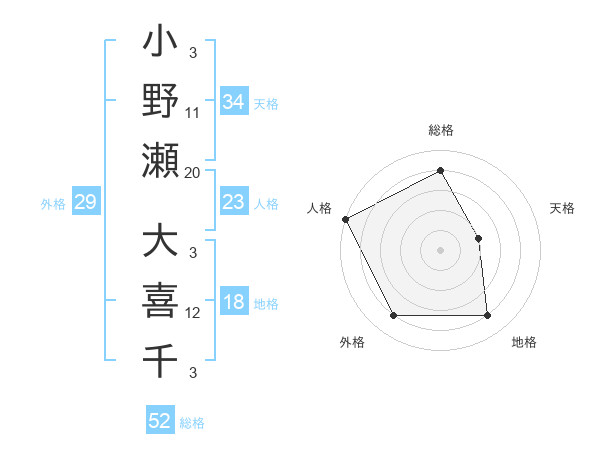 小野瀬 大喜千さんを姓名の画数から五運を鑑定