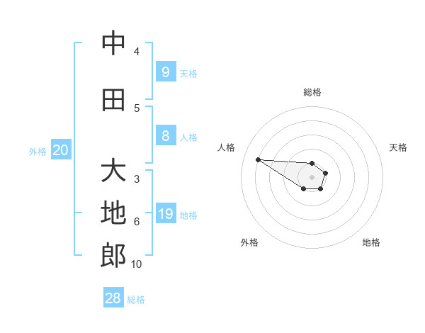 中田 大地郎さんの総格は28画の1点
