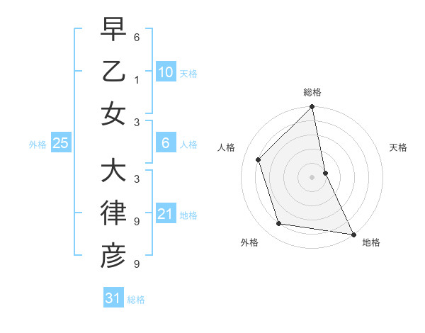 早乙女 大律彦さんを姓名の画数から五運を鑑定