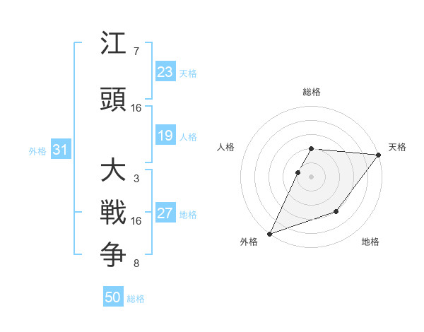 江頭 大戦争さんを姓名の画数から五運を鑑定