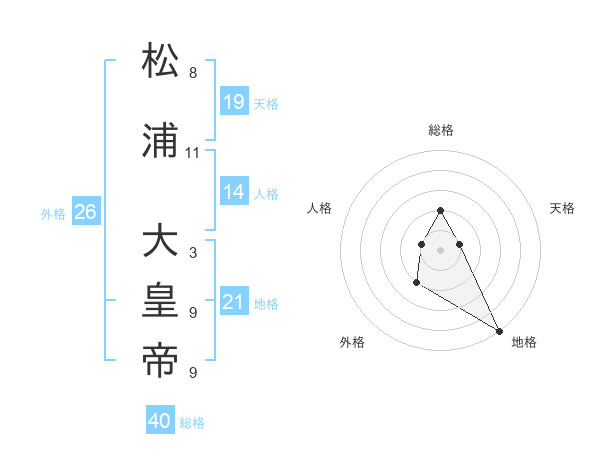 松浦 大皇帝さんの総格は40画の2点!