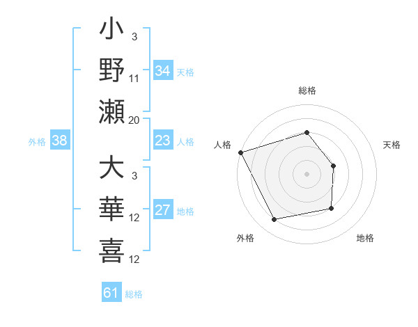 小野瀬 大華喜さんを姓名の画数から五運を鑑定