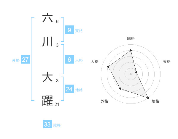 六川 大躍さんの総格は33画の4点!