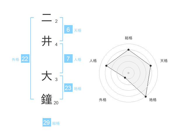 二井 大鐘さんの総格は29画の4点!