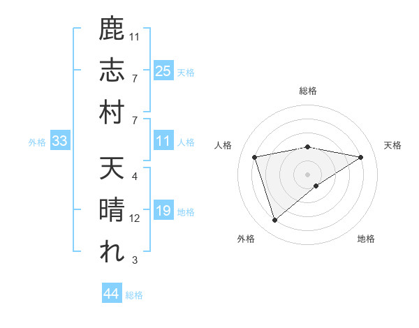 鹿志村 天晴れさんの天格は25画の4点!