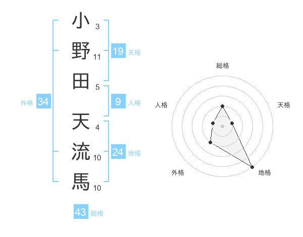 小野田 天流馬さんの総格は43画の2点!