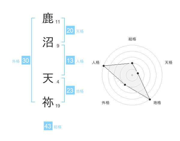 鹿沼 天祢さんの総格は43画の2点!