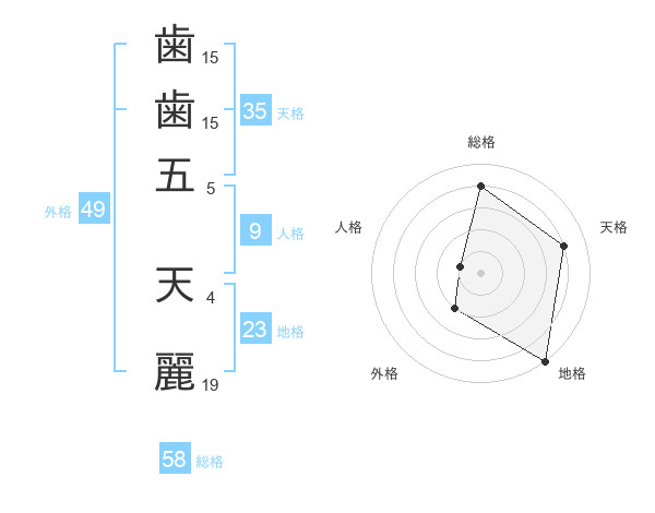 歯歯五 天麗さんの総格は58画の4点!