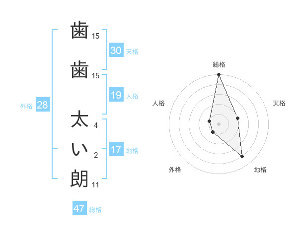 歯歯 太い朗さんの総格は47画の5点!
