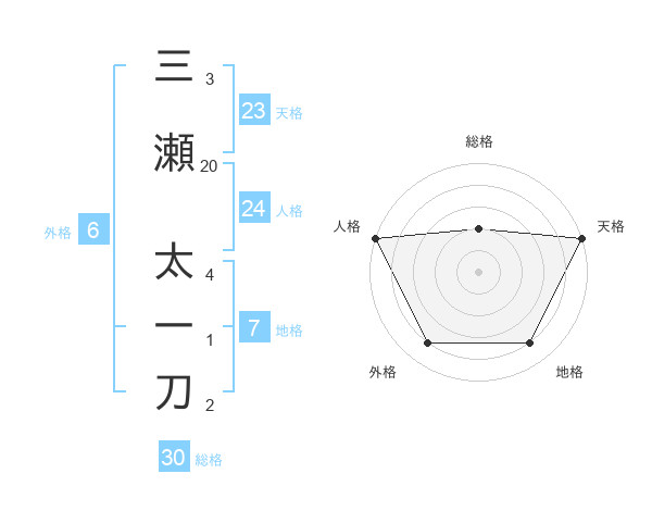 三瀬 太一刀さんの天格は23画の5点!