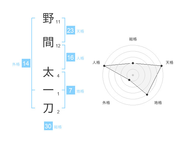 野間 太一刀さんを姓名の画数から五運を鑑定