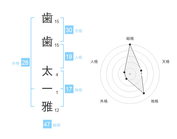 歯歯 太一雅さんの総格は47画の5点!