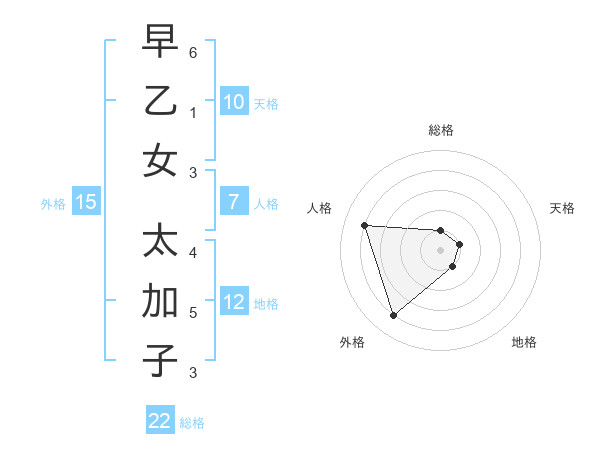 早乙女 太加子さんの総格は22画の1点!