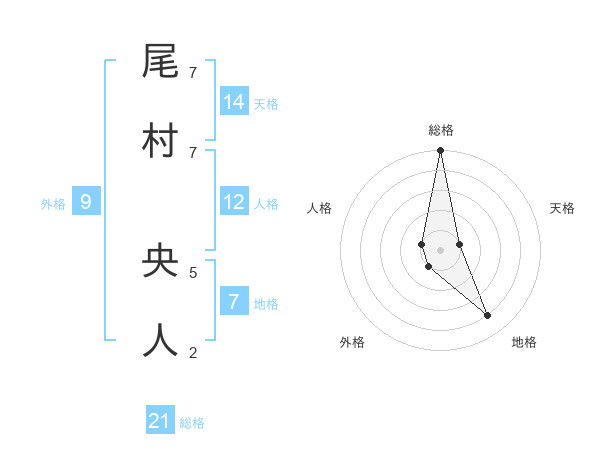 尾村 央人さんの総格は21画の5点!