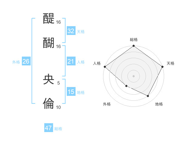 醍醐 央倫さんを姓名の画数から五運を鑑定