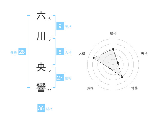 六川 央響さんの地格は27画の3点!