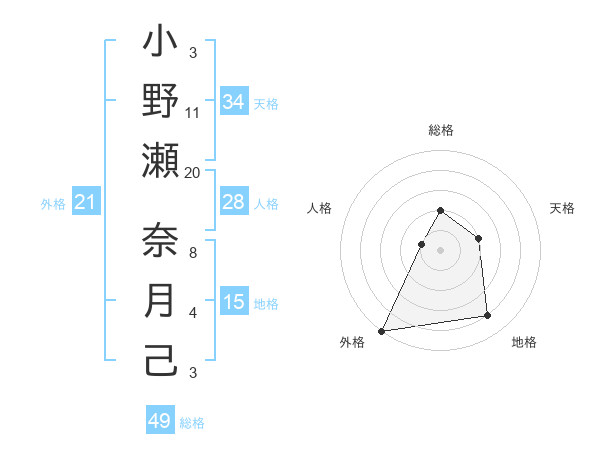 小野瀬 奈月己さんの外格は21画の5点!