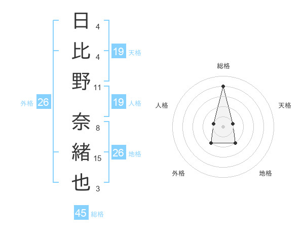 日比野 奈緒也さんの総格は45画の4点!