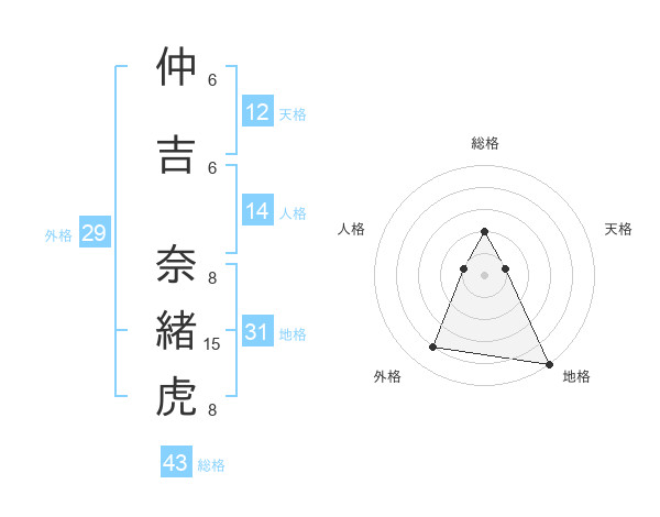 仲吉 奈緒虎さんの総格は43画の2点!