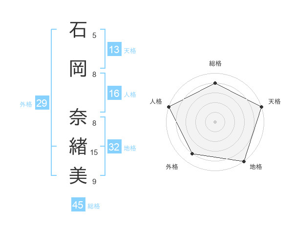 石岡 奈緖美さんの総格は45画の4点!