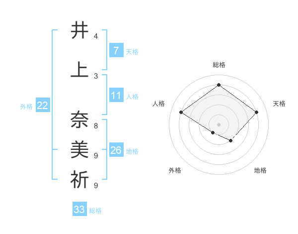 井上 奈美祈さんの総格は33画の4点!