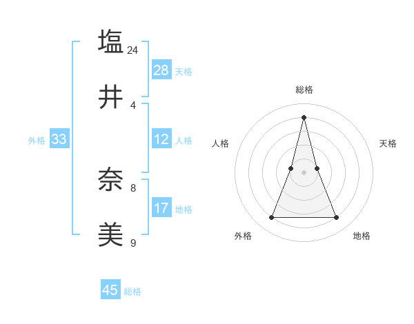 塩井 奈美さんの総格は45画の4点!