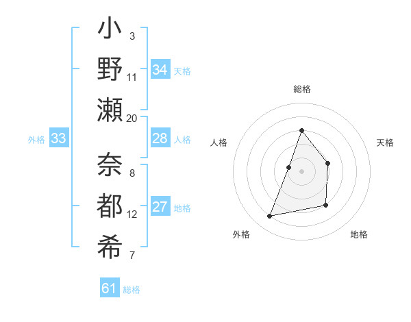 小野瀬 奈都希さんを姓名の画数から五運を鑑定