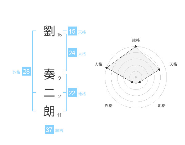劉 奏二朗さんの総格は37画の5点!