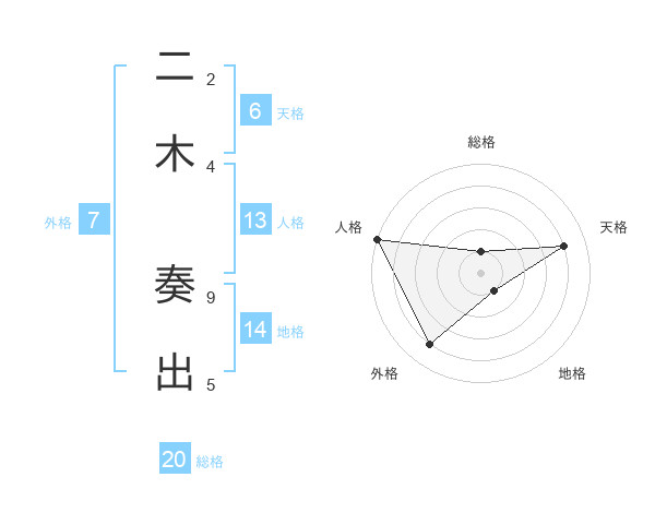 二木 奏出さんの総格は20画の1点!