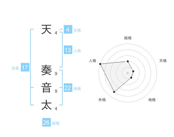 天 奏音太さんの総格は26画の2点!