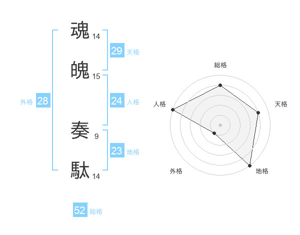 魂魄 奏駄さんの総格は52画の4点!