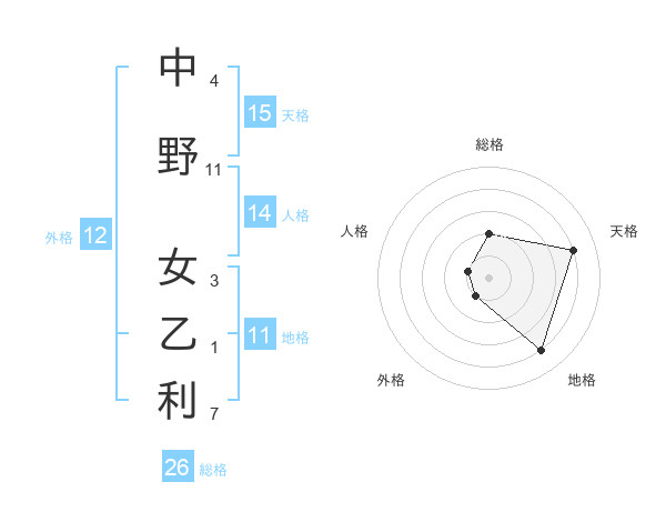 中野 女乙利さんを姓名の画数から五運を鑑定
