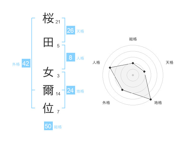 桜田 女爾位さんを姓名の画数から五運を鑑定