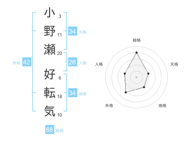小野瀬 好転気さんを姓名の画数から五運を鑑定