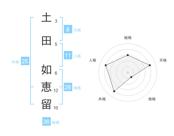 土田 如恵留さんを姓名の画数から五運を鑑定