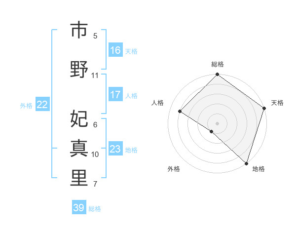 市野 妃真里さんの総格は39画の5点!