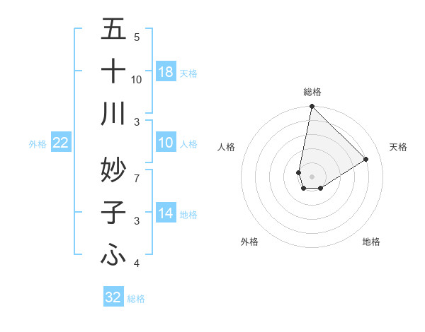 五十川 妙子ふさんを姓名の画数から五運を鑑定