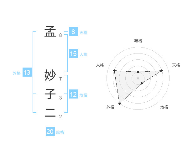 孟 妙子二さんの総格は20画の1点