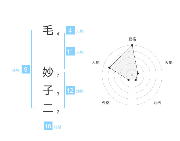 毛 妙子二さんの総格は16画の5点!
