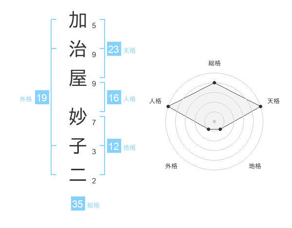 加治屋 妙子二さんの天格は23画の5点!